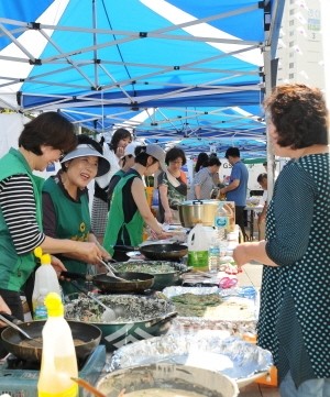 지난 21일 추석을 맞아 서울 강남구 도곡1동 주민센터 광장에서 열린 ‘풍성한 추석맞이 직거래장터’의 ‘먹거리장터’에서 새마을부녀회원들이 부침개를 만들고 있다.(사진제공=강남구청)