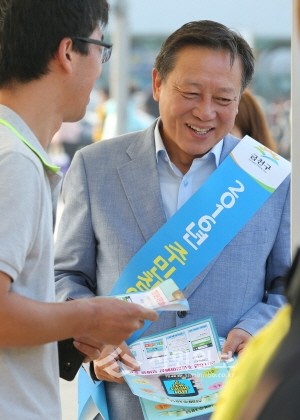 금천구는 최근 금천구청역 광장에서 '2016년 주민참여예산사업 모바일 투표'를 독려하는 가두홍보를 진행했다. 사진은 출근길 주민을 대상으로 주민참여예산 모바일 투표를 독려하고 있는 차성수 구청장의 모습.(사진제공=금천구청)