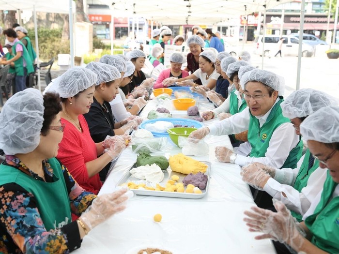지난 21일 도봉구가 새마을부녀회와 다문화가정 주부 등 100여명이 구청광장에 모여 '사랑의 송편나누기' 행사를 개최한 가운데 이동진 구청장이 주민들과 함께 송편을 만들고 있다. (사진제공=도봉구청)