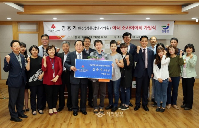 최근 전남 장흥군청 2층 상황실에서 군 소재 김안과의원 원장 김융기씨가 1억원 이상 고액기부자들의 모임인 '아너 소사이어티(Honor Society)'의 회원이 되는 가입식이 진행됐다. 사진은 김원장(가운데), 김성 장흥군수(뒷줄 오른쪽에서 세 번째)와 관계자들이 함께 기념촬영하고 있는 모습.(사진제공=장흥군청)