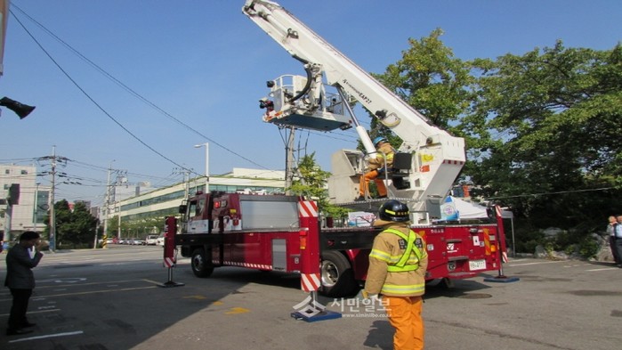 인천 부평소방서는 지난 22일 국민안전처 중앙소방본부 주관으로 소방차량 조작능력 평가를 본서 주차장에서 실시했다. 사진은 한 소방사가 소방차에 올라타 소방차량을 점검하는 모습.(사진제공=부평소방서)
