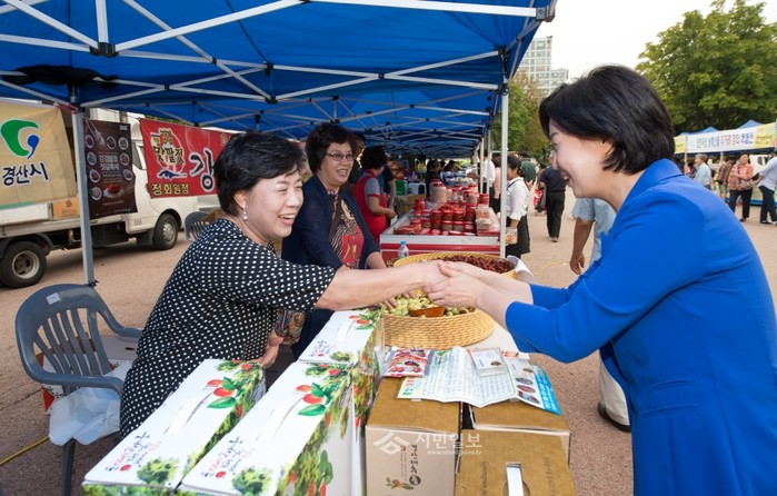 지난 23일 양천구 양천공원에서 열린 '추석맞이 직거래 양천장터'를 찾은 김수영 양천구청장(오른쪽)이 지역 특산물을 판매하고 있는 상인들과 대화를 나누며 장을 보고 있다.(사진제공=양천구청)