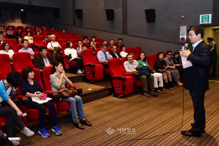 지난 23일 경기 수원시 소재 메가박스 수원남문점에서 홍상수 감독의 17번째 장편영화 <지금은 맞고 그때는 틀리다>의 시사회가열린 가운데 염태영 수원시장이 관객과 이야기를 나누고 있다. 영화 <지금은 맞고 그때는 틀리다>는 수원지역을 배경으로 촬영됐으며 배우 정재영·김민희씨가 주연을 맡았다. (사진제공=수원시청)