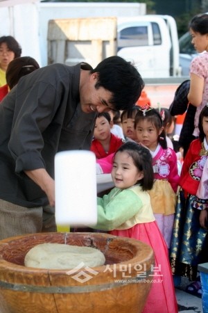최근 서울 강남구청 주차장에서 열린 ‘한가위 맞이 직거래 장터’를 찾은 한 아이가 부대행사로 열린 전통 떡메치기 행사에 참가해 체험을 하고 있다.(사진제공=강남구청)