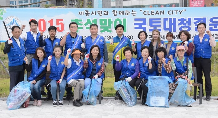 세종특별자치시가 추석을 앞두고 지난 23일 종촌동 제천뜰 근린공원의 상가주변 및 제천변에서 국토대청결운동을 펼쳐 이춘희 시장(뒷줄 가운데)을 비롯한 부녀회, 대한노인회, 호수공원지킴이 등의 참여자들이 청소에 앞서 기념촬영 하고 있다.(사진제공=세종시청)