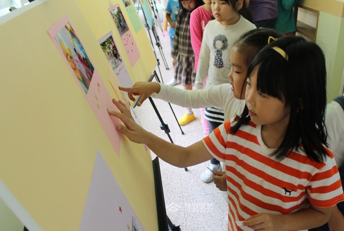 전남 광양시 태인초등학교는 최근 학생들의 올바른 인성의 밑거름을 다지고자 '안전교육 및 인성교육 실천주간'을 운영한 가운데 진행된 '좋은 친구 밝은 얼굴 콘테스트'에서 학생들이 전시된 친구들의 사진에 투표하고 있다.(사진제공=전남교육청)