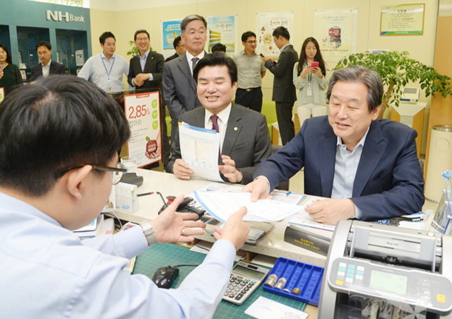 김무성 새누리당 대표와 원유철 원내대표가 24일 오전 서울 여의도 국회 본청 내 농협 창구에서 청년 일자리 창출 기금 조성을 위한 청년희망펀드 공익신탁 거래신청서를 작성한 뒤 직원에게 건네고 있다.