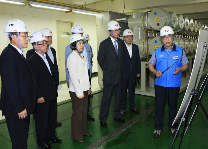 | ▲ 조환익 사장(오른쪽에서 세번째, 파란색 넥타이 착용)이 국회 산업통상자원위원회 소속 전정희 의원(오른쪽에서 네번째, 흰색 자켓 착용)과 함께 영등변전소에서 재해재난 발생대비 비상시 전력공급 대책을 점검 중에 있다. | ||