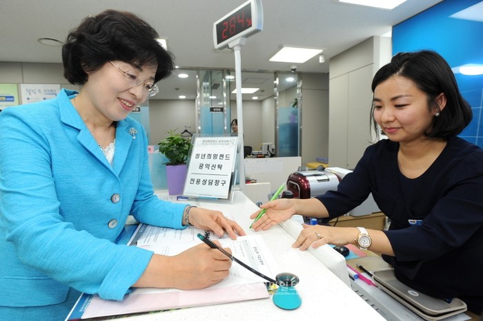 최근 일자리를 구하지 못한 청년들을 지원하기 위해 새롭게 문을 연 ‘청년희망펀드’의 가입을 위해 송파구청내 우리은행을 방문한 박춘희 구청장이 청년희망펀드에 가입 서류를 작성하고 있다.(사진제공=송파구청)