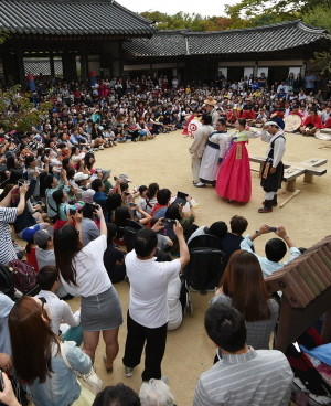추석연휴 마지막날인 지난 29일 오후 경기 용인시 기흥구 한국민속촌에서 시민들이 조선 캐릭터 코믹 마당극 ‘한가위 마을잔치’를 관람하고 있다./뉴시스