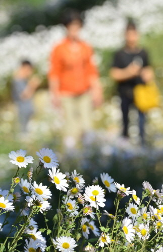 추석연휴 마지막 날인 지난 29일 오후 세종시 영평사를 찾은 가족단위 관람객들이 은은한 향을 풍기는 구절초 동산을 산책하며 명절피로를 씻어내고 있다.