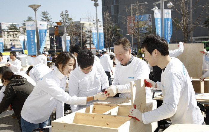 | ▲ 박용만 회장과 두산 임직원 200여 명이 지난 3월23일 ‘Doosan Day of Community Service’(두산인 봉사의 날) 두 번째 행사를 맞아 서울 중구 을지로 두산타워 광장에서 지역사회 저소득층 가정에 전달될 ‘따뜻한 가구 만들기’ 작업에 나섰다. 지난해 10월 처음 실시한 ‘Doosan Day of Community Service’는, 두산이 사업을 영위하는 모든 곳에서 임직원이 각 지역사회에 필요한 일을 찾아 공헌 활동을 펼치는 행사다. | ||