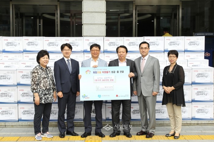 최근 어려운 이웃을 위해 김 120세트를 기부한 서울 구로구 구로동 베다니교회가 이성 구청장(오른쪽에서 세 번째)과 전달식 후 기념촬영을 하고 있다.(사진제공=구로구청)