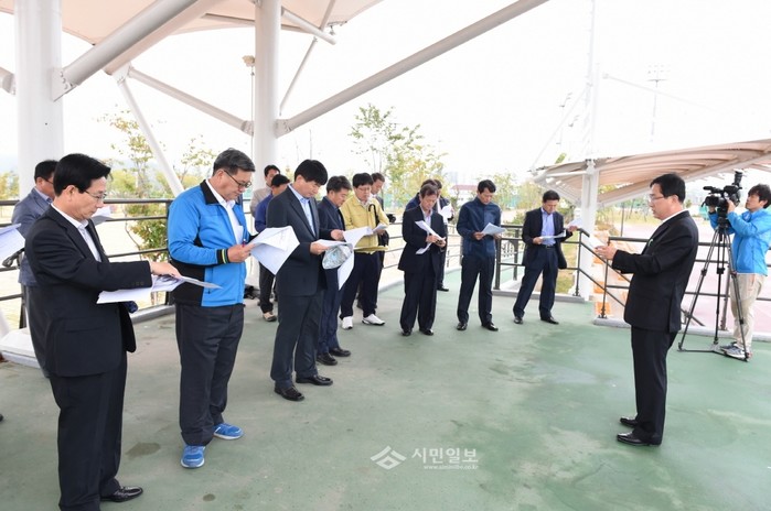경기 양주시는 1일 백석생활체육공원에서 양주시장 권한대행 김건중 부시장(왼쪽에서 두 번째)과 관계공무원 등이 참석한 가운데 오는 17일 개최되는 ‘제13회 시민의 날 기념식 및 시민 화합 운동회’ 추진상황에 대한 중간점검을 진행했다.(사진제공=양주시청)