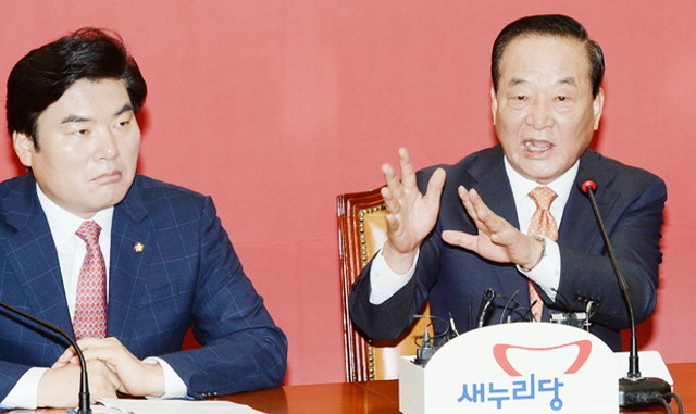 1일 서울 여의도 국회에서 열린 새누리당 최고위원회의에서 서청원 최고위원이 “안심번호는 국민공천제 아니다”라며 격앙된 어조로 김무성 대표를 비판하고 있다.