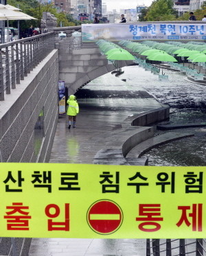 전국적으로 비가 내리고 있는 1일 오후 서울 청계천 산책로가 침수 위험으로 출입이 통제되고 있다.