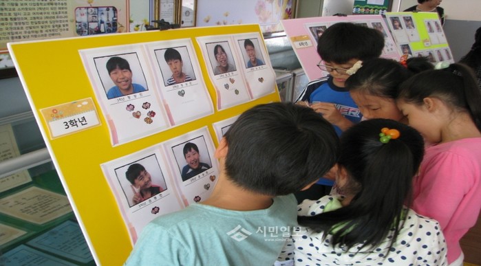 전남 광양시 다압초등학교가 최근 인성교육실천주간 운영 프로그램 중 하나인 ‘웃는 얼굴 선발대회’를 열어 학생들이 복도에 전시된 사진 중 가장 예쁘게 웃고 있는 친구의 사진에 스티커를 붙이고 있다.(사진제공=전남교육지원청)