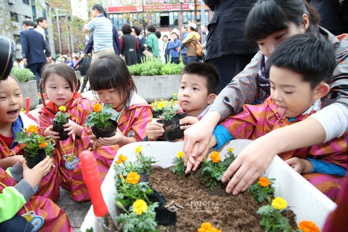 최근 마포구 경의선숲길 연남동 구간에서 '가을맞이 마을축제'가 개최된 가운데 축제의 일환으로 진행된 '꽃심기 행사'에 참석한 아이들이 국화꽃을 심고 있다. (사진제공=마포구청)