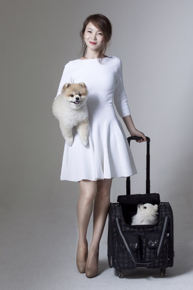 사진 속 왁스는 하얀색 원피스를 입고 강아지를 왼손에 안고 다른 한 손에는 강아지가 든 캐리어를 잡고 카메라를 향해 웃음 짓고 있다.
