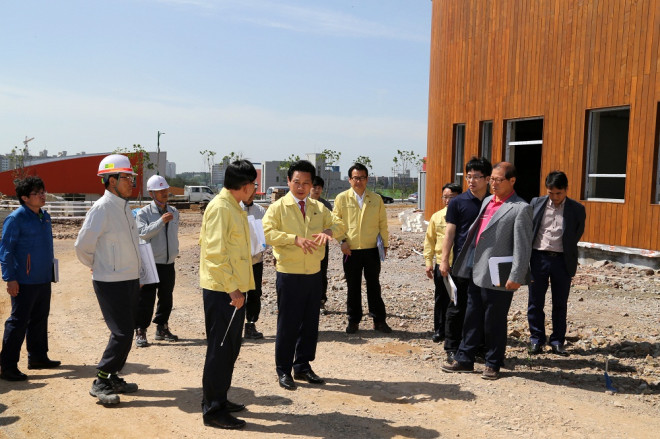 | ▲ 지난 5월 문화관광산업발전을 위해 건설중인 '다목적종합문화체육' 건설현장을 방문한 전동평 군수가 관계자들고 현장을 살펴보며 이야기를 나누고 있다. | ||