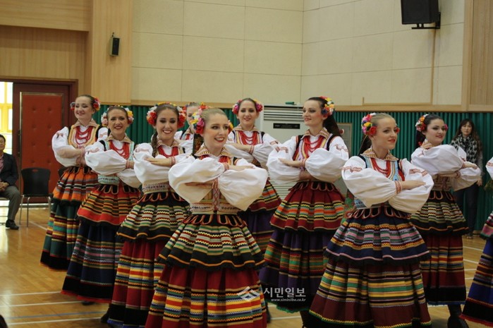 최근 경기 부천시 옥산초등학교는 브라질, 세르비아, 폴란드, 아르헨티나 4개국 120여명의 공연단을 초청해 세계 민속춤 공연을 개최했다. 사진은 폴란드 민속춤을 추고 있는 공연단의 모습.(사진제공=부천교육지원청)