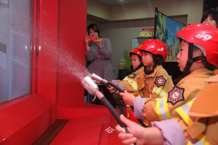 서울 동작소방서는 최근 소방서 3층 소방안전체험교실에서 평강유치원 어린이 25명에게 소방안전교육을 실시했다. 사진은 교육에 참가한 어린이들이 물 소화기를 뿌리며 소화기 체험을 하는 모습.(사진제공=동작소방서)