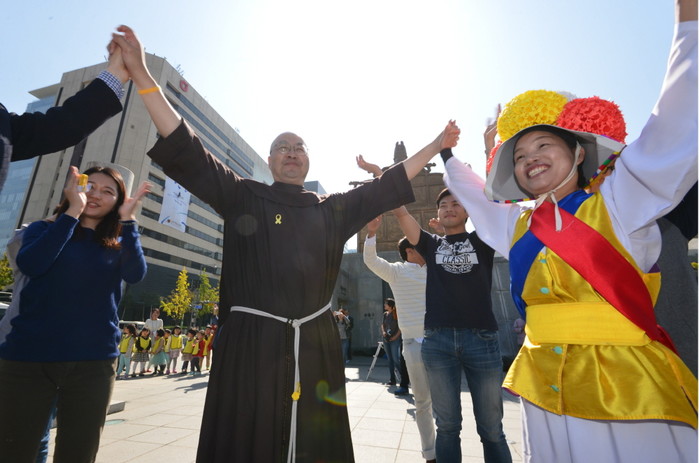 지난 5일 오전 서울 종로구 광화문광장 세종대왕 동상 앞에서 열린 '안전한 기후여정을 위한 기원식'에서 참가자들이 안전한 여정을 기원하는 지신밟기 퍼포먼스를 하고 있다./뉴시스