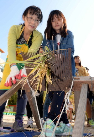 지난 5일 오전 서울 노원구 상천초등학교에서 열린 농사체험에서 한 학생이 홀테를 사용해 탈곡을 하고 있다./뉴시스