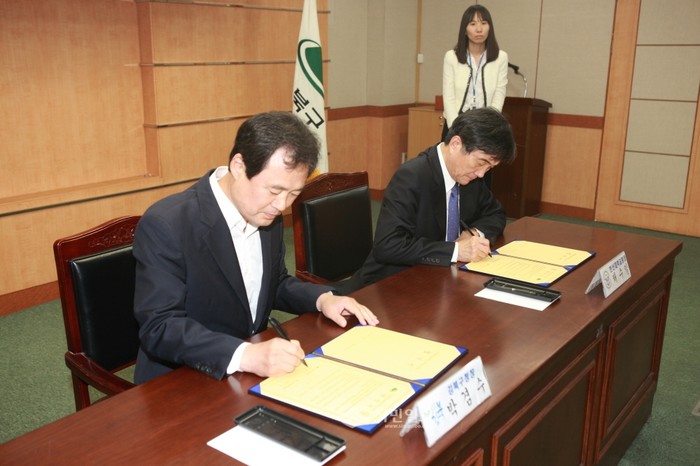 박겸수 서울 강북구청장(왼쪽)이 지난 5일 오후 3시 구청 기획상황실에서 채수일 한신대학교 총장과 협력체계를 갖추고 '강북구사회적경제통합지원센터' 운영에 함께 노력하고자 업무협약을 맺고 있다.(사진제공=강북구청)