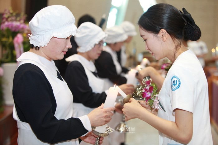 안산대학교 간호학과는 최근 학교 채플관에서 '제42회 나이팅게일 선서식'을 열고 생명존중과 봉사, 희생정신을 새롭게 다짐했다. 사진은 선서식에서 나이팅게일의 숭고한 정신을 상징하는 촛불 점화식이 진행되고 있는 모습.(사진제공=안산시청)