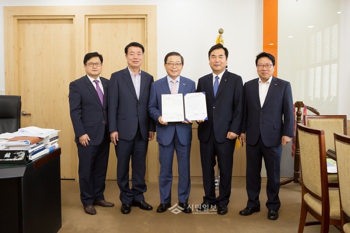 남유진 경북 구미시장은 지난 5일 청년일자리 문제 해결을 위해 '청년희망펀드' 가입신청서에 서명하고 경상북도 기초자치단체장으로는 1호로 대구은행에 가입했다. 사진은 이날 남 시장(가운데)과 은행 관계자들이 기념촬영한 모습.(사진제공=구미시청)