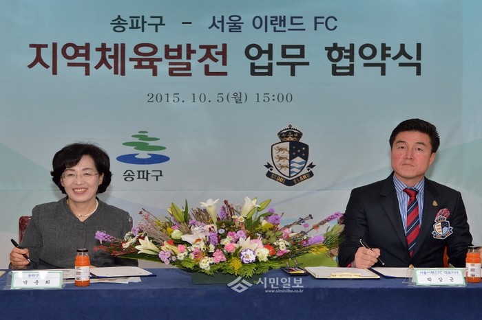지난 5일 서울 구청 기획상황실에서 상호간 협력을 위해 열린 ‘송파구-서울이랜드FC 업무협약식’에 참석한 박춘희 구청장(왼쪽)이 협약서에 서명하고 있다.(사진제공=송파구청)