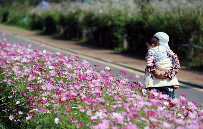 지난 6일 서울 동대문구 군자교~이화교 방면 중랑천 둔치에 코스모스가 만개한 가운데 한 시민이 아기를 업고 코스모스를 감상하며 걷고 있다.(사진제공=동대문구청)