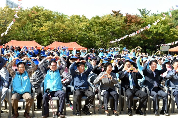 김성환 노원구청장(왼쪽에서 세 번째)이 지난 6일 오전 10시 중계동 노해근린공원서 열린 ‘제11회 북부어울림 체육대회’에 참석해 내빈, 주민들과 함께 체육대회의 시작을 알리며 하트를 그리고 있다.(사진제공=노원구청)