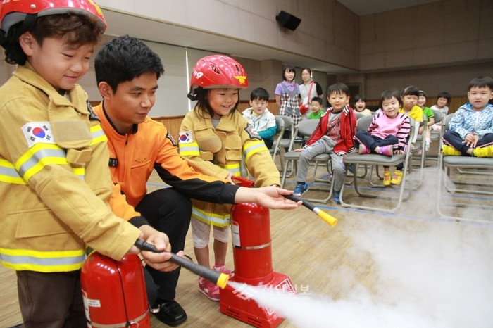 서울 구로소방서는 7일 오전 10시30분 본서 대강당으로 새솔어린이집과 구로한빛어린이집 원생 30여명을 초청해 소방안전 체험교육을 실시했다. 사진은 이날 어린이들이 소방대원의 도움을 받아 소화기 사용체험을 하고 있는 모습.(사진제공=구로소방서)