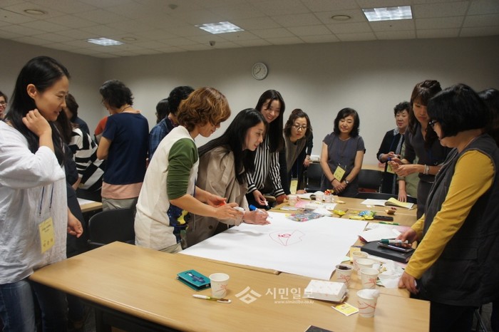경기 화성시는 이달 6~7일 이틀간 라비돌리조트에서 지역내 45개 동아리 임원 100여명이 참여한 ‘2015 화성시 평생학습동아리 연수’를 개최했다. 사진은 임원들이 도화지에 그림을 그리는 모습.(사진제공=화성시청)