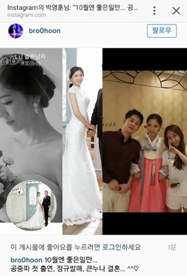 또한 순백의 웨딩드레스를 입고 예비 신랑과 함께 아름다운 미소로 포즈를 취하고 있는 큰누나의 사진에 “10월 18일 축하 부탁드립니다! 축가는 당연히 제가!!”라는 글로 축가 소식까지 알렸다.