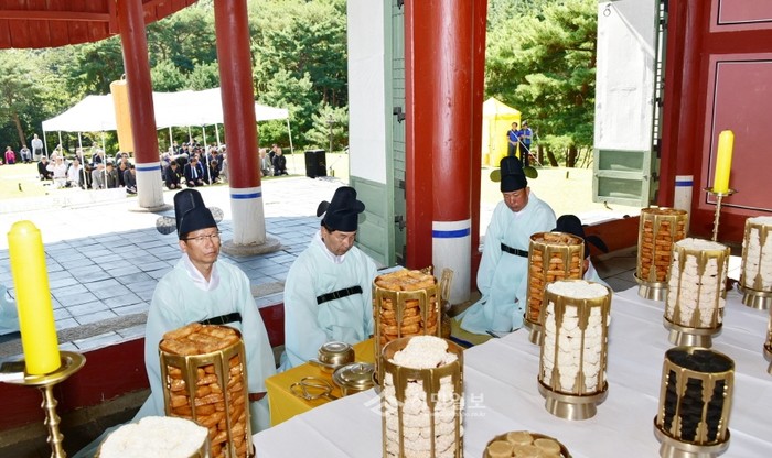 최근 경기 김포시 장릉에서 원종(추존왕)과 인헌왕후 구씨의 '제396주기 봉향제'가 봉행됐다. 사진은 제관들이 제례를 지내고 있는 모습.(사진제공=김포시청)