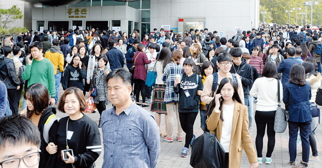 11일 오후 서울 마포구 홍익대 홍문관에서 2016 홍익대 수시 논술고사를 치른 수험생들이 교정을 나서고 있다.