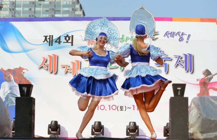 최근 동대문구 장안동에서 '제4회 세계거리춤축제'가 열린 가운데 축제에 참가한 외국인 무용단이 무대에 올라 팔짱을 끼고 춤을 추고 있다.(사진제공=동대문구청)