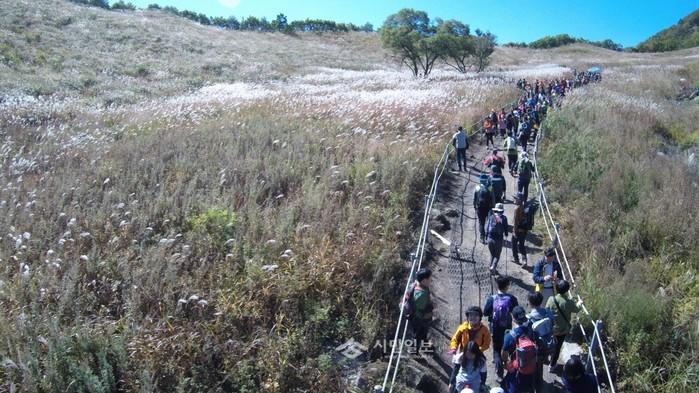 경기 포천시 산정호수에서 최근 '제19회 산정호수 명성산 억새꽃축제'가 성료한 가운데 축제를 찾은 시민들이 은빛으로 펼쳐진 억새꽃 사이 등산로를 따라 산을 오르고 있다.(사진제공=포천시청)