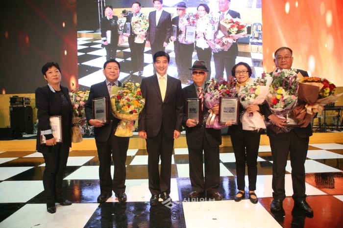 서울 강동구가 지난 11일 서울 암사동 유적에서 열린 ‘강동구민의 날 기념식’에서 ‘제24대 강동구민대상 시상식’을 개최한 가운데 이해식 구청장(왼쪽에서 세 번째)과 수상자들이 기념촬영을 하고 있다.(사진제공=강동구청)