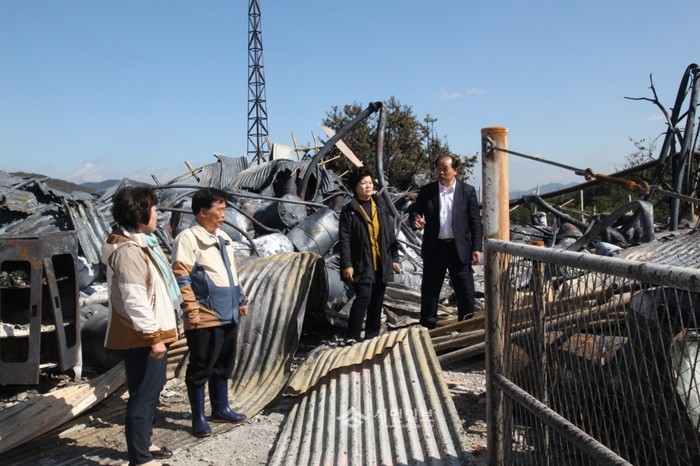 지난 12일 경기 용인시의회 이건영·박원동·김운봉·김상수 의원이 지역내 안전 문제가 대두된 물류창고 화재 현장을 방문해 대책을 논의하고 있다.(사진제공=용인시의회)
