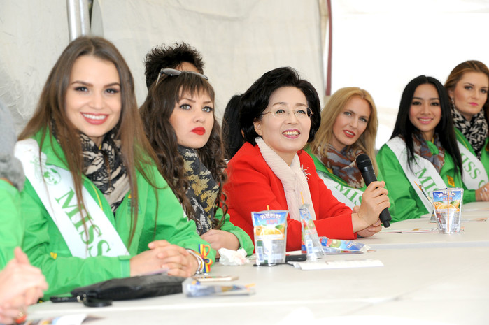 박춘희 서울 송파구청장(왼쪽에서 세 번째)이 지난 11일 몽촌토성과 평화의 문 일대에서 열린 '제15회 한성백제문화제'를 찾은 2015글로벌뷰티퀸 미인대회 참가자들과 담소를 나누고 있다. (사진제공=송파구청)