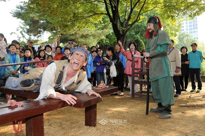 최근 송파구가 주최 한성백제문화제추진위원회 주관으로 올림픽대로 일대에서 열린 '제15회 한성백제문화제' 한성백제 체험마을에서 펼쳐진 '곤장 퍼포먼스'를 참가자들이 구경하고 있다.(사진제공=송파구청)