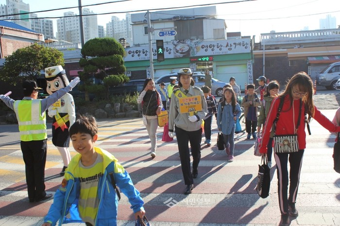 인천 중부경찰서는 13일 오전 신흥초등학교에서 어린이들의 교통사고 예방 홍보를 위한 '스쿨존 안전보호 캠페인'을 실시해 등교하는 어린이들이 경찰관과 함께 횡단보도를 건너고 있다.(사진제공=중부경찰서)