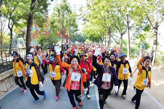 인천 부평구 노인인력개발센터는 13일 신트리공원과 굴포천 둘레길에서 ‘제3회 신바람 가을 운동회’를 개최해 홍미영 부평구청장(앞줄 오른쪽에서 세 번째)과 참여자들이 둘레길 걷기를 진행하고 있다.(사진제공=부평구청)