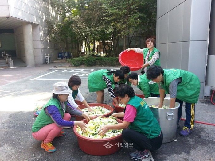 경기 부천시 오정구 성곡동 새마을부녀회는 최근 밑반찬을 만들어 지역내 홀몸노인 30가구에 전달하는 사업을 진행한 가운데 참여 회원들이 홀몸노인에게 전달할 김치를 담고 있다.(사진제공=부천시청)