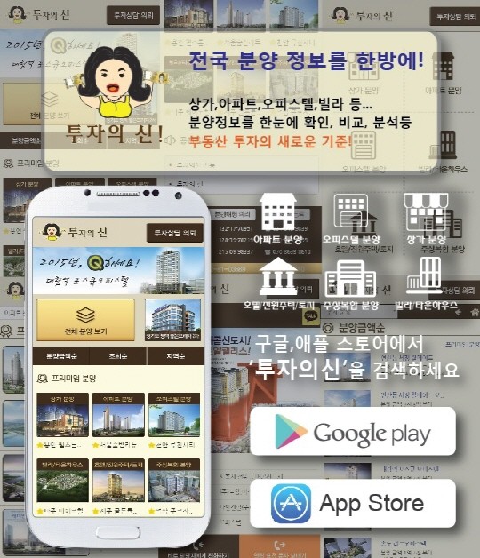 기존의 투자자는 발로 뛰어 제한적인 분양정보와 한정된 투자처를 알 수 있었지만 "투자의 신" 어플에는 아파트 분양, 오피스텔 분양, 상가 분양, 빌라 분양, 전원주택 분양, 타운하우스 분양, 수익형 호텔 분양까지 투자자들이 알기 쉽고 사용하기 편리하게 만들어 졌다.