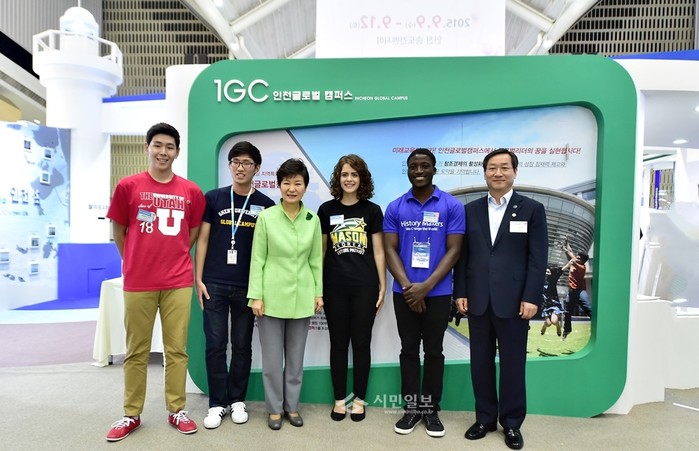| ▲ 희망박람회= 인천에서 열린 '지역희망박람회'를 찾은 박근혜 대통령이 인천글로벌캠퍼스의 4개 대학 학생대표들을 만나 학교생활에 대한 대화를 나누고 기념촬영을 하고 있다. | ||